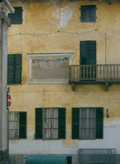 in pessimo stato: il bordo superiore è svanito, e la metà inferiore è stata malamente coperta, così che resta visibile solo una striscia frastagliata, irregolare, per altro di buona fattura, e di iconografia insolita, non tanto per i personaggi che reggono il telo – la Madonna affiancata da due angeli e da S. Giovanni Battista e S. Antonio da Padova – quanto perché qui l’ostensione avviene in un interno.
