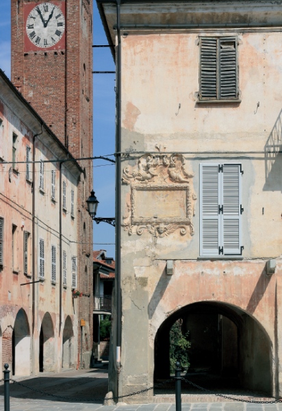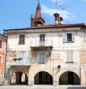 Di fronte al Castello, al di là della piazza, all’imbocco della strada principale, c’è una casa che sullo spigolo al primo piano conserva un affresco sindonico singolare, non tanto per il dipinto, sbiadito per il degrado, quanto per la grande cornice di stucco, che supera l’affresco per sviluppo fantastico e qualità di esecuzione.