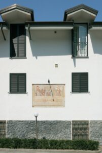 Valgrana è un paese all’imbocco della Valle Grana, che qui si apre sulla pianura cuneese; la casa dell’affresco è occupata dall’Albergo del Viale, e ha la facciata principale su Piazza Marconi, di fianco al viale di platani che porta in centro, mentre la facciata laterale, quella dell’affresco, è girato l’angolo, sulla Via Perrella.