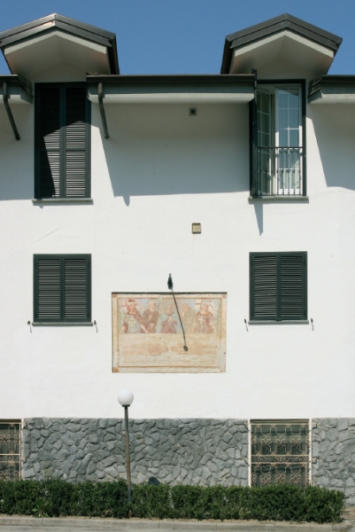 L’albergo è stato recentemente ristrutturato, senza sminuire l’affresco, com’è successo a Virle, così che oggi si può ancora apprezzarne, la salda composizione, che affida ai due soldati ai capi opposti – S. Magno e S. Mauro, martiri della Legione Tebea – il compito di tenere teso il lenzuolo, lasciando così liberi la Madonna in centro e S. Giuseppe e S. Antonio da Padova di fianco a lei, di muoversi come vogliono, alternando posizioni statiche e posizioni dinamiche convergenti e divergenti, con un ritmo naturale animato dalle bandiere che sventolano contro il cielo.