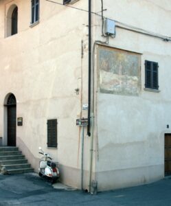 L’affresco (1695) è alto sullo spigolo di una casa privata sul lato sinistro della strada, sta dentro una cornice dipinta, ed è inspiegabilmente malandato, così che si distinguono appena la Madonna, S. Giuseppe e S. Giovanni Battista, i quali per via del formato non riescono a tendere bene il lenzuolo, che è tutto pieghe, particolare che però forse si rivela in accordo con la stesura mossa del resto dell’affresco.