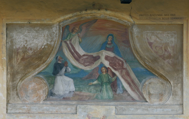 L’affresco (XVII secolo) è uno dei più interessanti per le particolari soluzioni formali e iconografiche: infatti è inserito in una cornice di stucco dal disegno dinamico, tutto curve, interna alla cornice rettangolare di stucco che si rapporta alla facciata, e questa scelta dinamica è causa ed effetto della insolita composizione dinamica dell’ostensione: infatti il Telo qui non è teso orizzontalmente, ma pende dall’alto tenuto da un angelo e, in un angolo, la