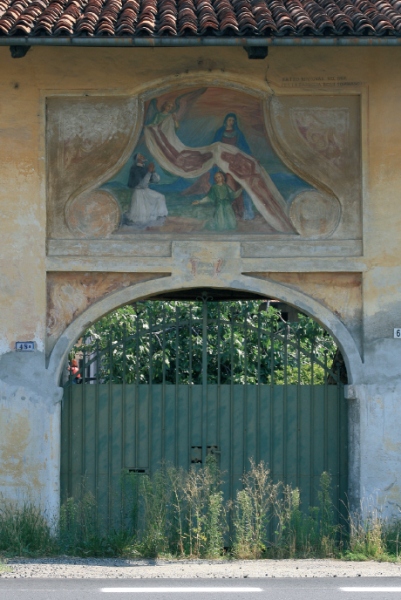 La cascina con l’affresco è a filo strada, con l’ingresso a un estremo del lungo fronte, nel quale costituisce l’elemento di riconoscimento, per il grandem portone carraio in legno e per il grande affresco, che si dividono la striscia della facciata.
