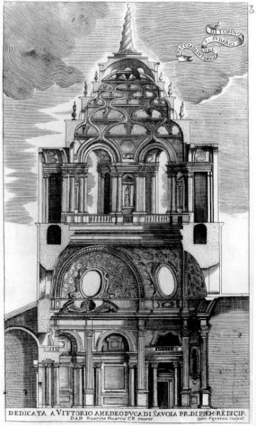 Si riconosce marmo nero di Frabosa nella parte bassa, realizzata da Bernardino Quadri fino a poco oltre l’altezza dell’ordine principale; per quanto realizzato da Guarino Guarini, dal tamburo in su, si riconosce invece marmo bigio (questo è il nome nei documenti) di Frabosa.